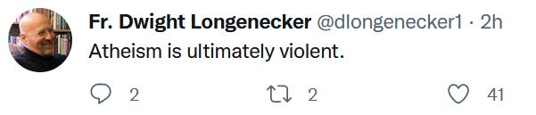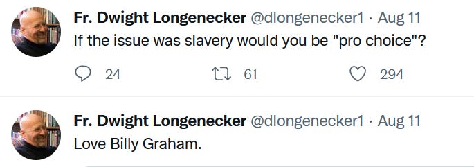 I didn’t respond “Light Dongenecker” to any of these tweets because they just keep coming, too fast to keep up with. They have been coming for years; Longenecker has no shortage of terrible, ignorant opinions, and he’s desperate to share them with all of you as often as he can, and he’s finally starting to get a little upset when people point out that he maybe hasn’t thought everything through.