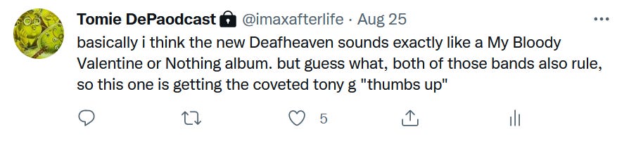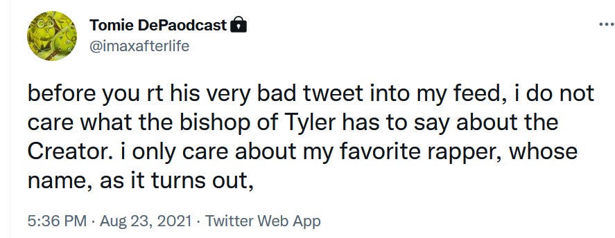 None of these are good, except the last one, which is outstanding. But, as with Longenecker, my tweets help shape the kind of image of myself that I’m trying to project: I’m a stupid online dipshit who listens to shoegaze and likes typing idiotic things on my phone and seeing the screen light up. My credentials begin and end with “stupid online dipshit”; Longenecker’s credentials, according to his website, begin here: