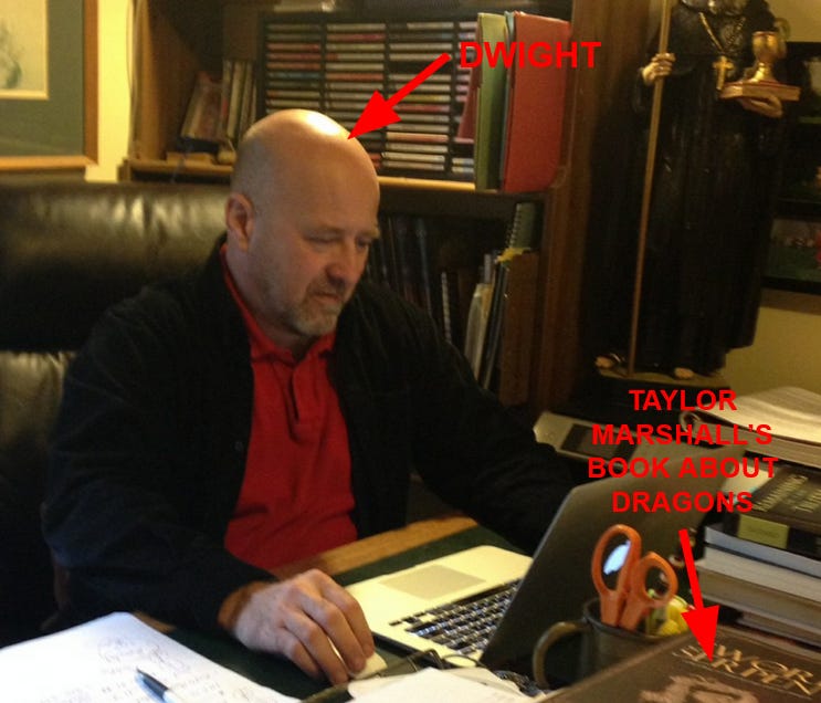 And, as we all know, the sewage can also flow the other way. If Longenecker is online all of the time, and especially if he’s tweeting to an audience of conservative Catholics, then he’s just slurping up all of that sewage in that corner of the internet. We have seen this all of the time with our clergy: I’ve looked at how it affects our bishops, and how it impedes our church’s ability to respond to reality in front of them, and hell, the first G.O.T.H.S. piece I ever wrote was about a priest swimming in right-wing memes for four years until he completely lost his grip. Longenecker doesn’t think racism is real anymore; he’s not the only Catholic clergyman who thinks this way, and he can find plenty of Twitter accounts and YouTube channels that will help him feel validated and even holy for thinking this way. And maybe Longenecker isn’t familiar with any of those Twitter accounts and YouTube channels, except that in a picture on his own website he shows himself sitting at his desk with what is clearly a copy of Sword and Serpent, anti-Pope conspiracy theorist Taylor Marshall’s terrible YA novel about dragons: