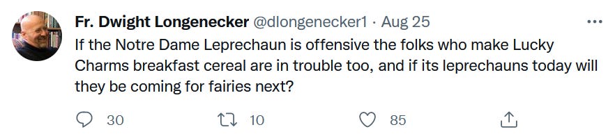That’s where his credentials begin, but they still end at “stupid online dipshit”. Longenecker’s job, presumably, is to provide pastoral and sacramental care for the families at Our Lady of the Rosary church in Greenville. But he seems to prefer to spend his time scouting out the internet, and his own provincial assembly, for people who agree with him that he’s right about everything. And if that’s how he’s spending a large chunk of his time, it’s potentially affecting his ability to listen to his parishoners, to counsel couples preparing for marriage, to hear confessions and absolve sins, to care for the sick, to visit the imprisoned. These are things he can’t do effectively if he’s pulling out his phone every five minutes to argue that Notre Dame should keep its leprechaun mascot.