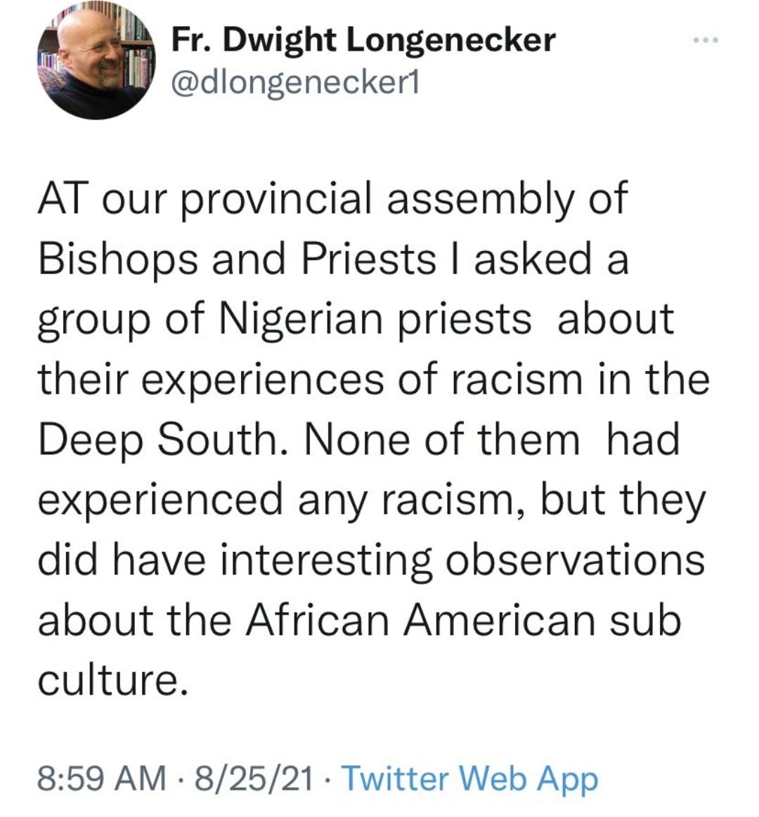 Zero Catholic clergy should be on Twitter; I’ve been a big believer in that since long before I started work on this project. When it comes to authority and credentials in Catholicism, you should treat Longenecker the same way you should treat me: as a stupid online dipshit who needs to log off. When he posts something willfully ignorant, something that extrapolates the un-reality of racism from one half-assed possibly fake conversation with a group of Nigerian priests, something that avoids any understanding of reality that any idiot could pick up by reading a single book on American history, people will make fun of him for his bad post, and he’ll get upset, and then he’ll complain that people on Twitter are too mean and quick to judge. Just like every other stupid online dipshit. Except that Longenecker chose to be a Catholic priest. As part of his ordination, he once laid on the floor of a church while the Litany of the Saints played and the Holy Spirit blew over him. Armed with that, he now chooses to be a stupid online dipshit, multiple times a day.