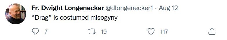 All of these tweets, which are just from the past fifteen days, are terrible. They are poorly composed, based on appalling personal views, and driven by Longenecker’s apparent need to show everyone that he’s right, all of the time, about everything, that he’s thought about it longer, that he’s come up with a pithier way to deconstruct it, that he’s not going to explain himself, you’re either smart and moral enough to get him or you’re not. This is, perhaps, not a great temperament for a pastor to have, and a pastor desperate to show everyone that racism can’t possibly be real maybe shouldn’t be running a parish in a state that just took the Confederate flag down from their statehouse grounds a whopping six years ago in response to a racist massacre.