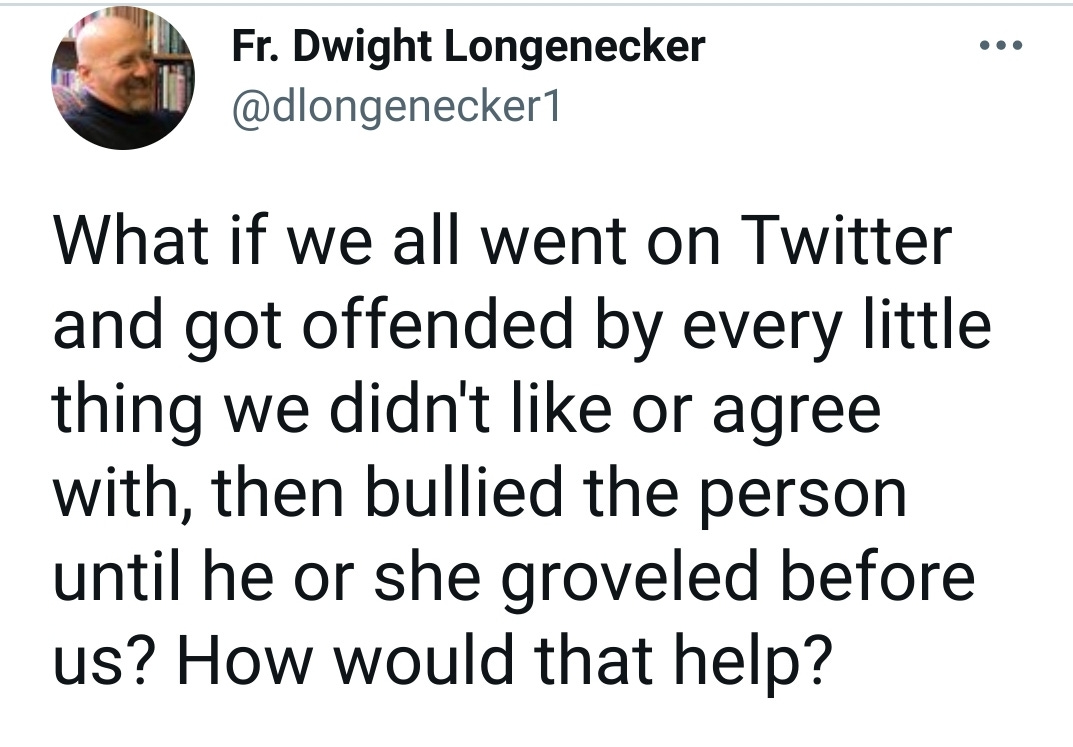 Now, to address Fr. Longenecker directly: I do agree with you that piling on each other on Twitter helps nobody. I agree that we shouldn’t be logging onto Twitter and foaming at the mouth every time we see a thought with which we disagree. Hell, my posts certainly aren’t good, and nobody needs to see them. I completely agree that we should all spend less time posting, less time being angry online, and more time fully present with the people around us, being Christ to them as best we can. So in conclusion, since you’re the one who’s ordained: you first, dipshit.